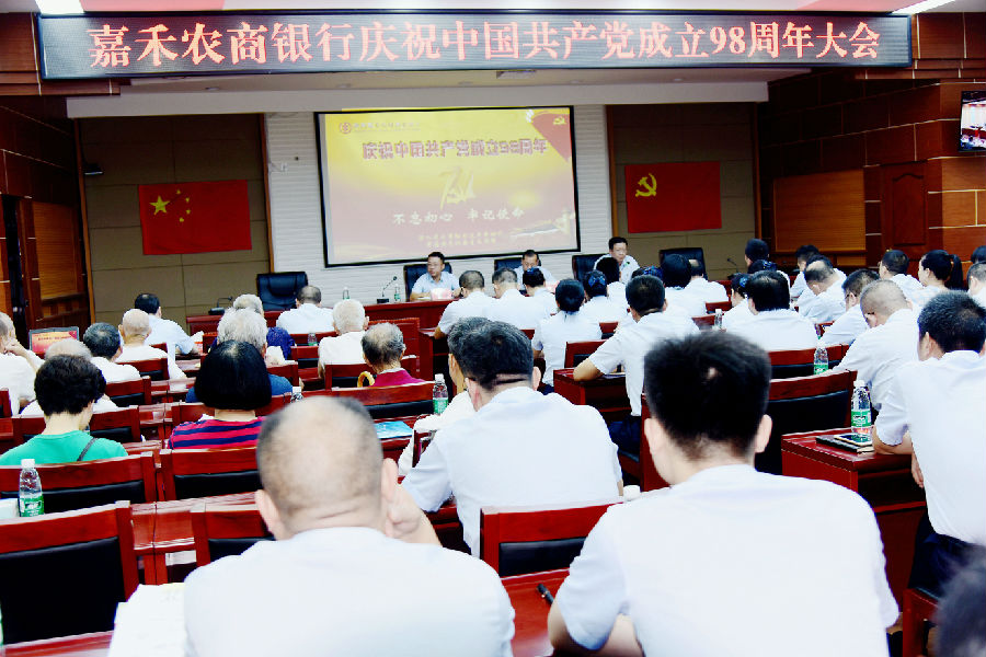 7月2日,嘉禾农商银行在二楼会议室召开庆祝中国共产党成立98周年暨 “不忘初心、牢记使命”专题教育动员大会,该行党委班子成员、各支部党员共计80人参加会议,各支行行长列席会议。会议由嘉禾农商银行党委委员、纪委书记、监事长胡久芳主持。