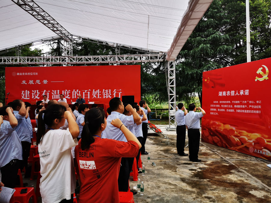 仪式在欢快的歌声中开始,红石林镇党委书记、龙天坪村第一书记分别致词,对古丈农商银行党建共创金融普惠首站选定龙天坪村表示热烈欢迎,并表示将积极配合该项工作推动。河西支行行长陈彦波宣读服务承诺,党委副书记、行长张华宣传湖南农信宣言,表明全行员工集体意志和行动,党委书记、董事长向永才领誓湖南农信人承诺,全体参加启动仪式的农商银行员工起立,面对承诺墙,举起右手,庄严宣誓。参加宣誓人员声音洪亮、斗志昂扬,承诺声回荡在村小上空。
