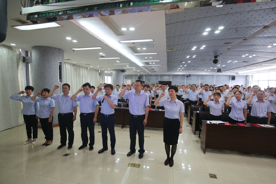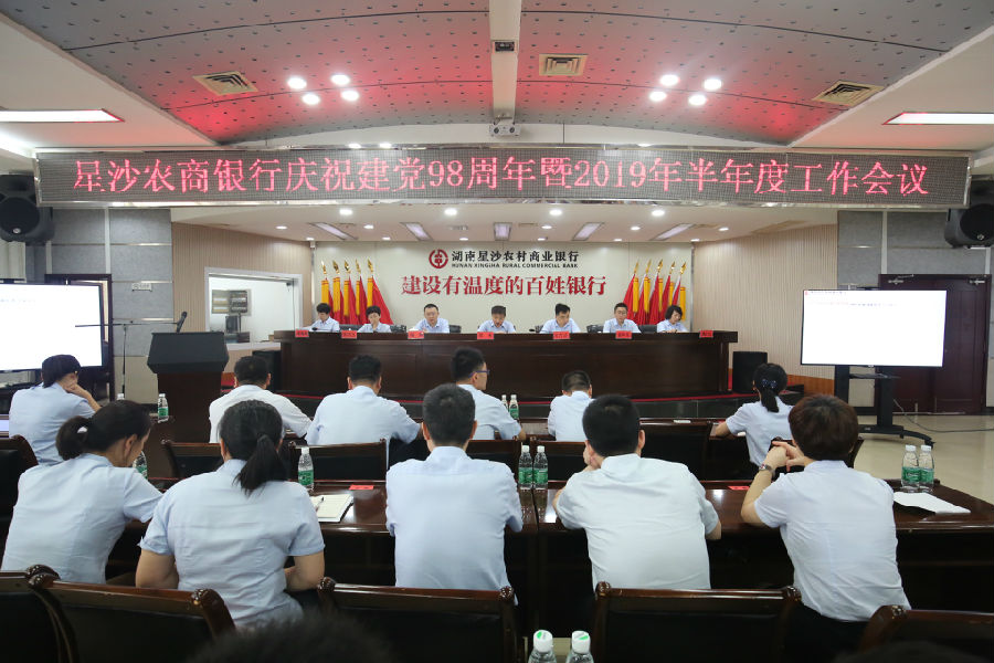7月19日上午,星沙农商银行组织召开了庆祝建党98周年暨2019年半年度工作会议,总行领导班子成员、副协理员、风险总监、部室负责人、支行正副行长、会计、客户经理、机关工作人员、稽核大队、各村行正副行长、会计、先进党支部代表、先进党务工作者、优秀共产党员、新党员共200余人参与了本次会议,会议由行长田万顷主持。