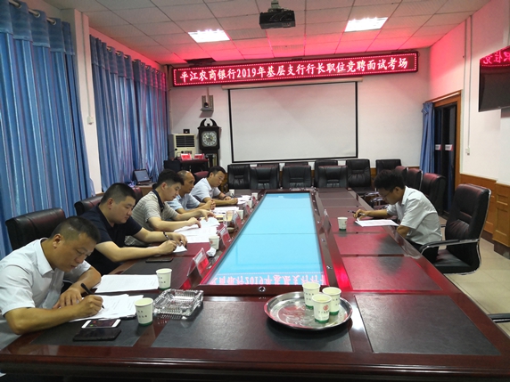 7月29日晚,平江农商银行在总行五楼小会议室举行2019年基层支行行长职位竞聘面试,来自基层网点的6名员工作为候选人参加面试,由总行班子成员、部门经理组成的评委会出席本次面试。