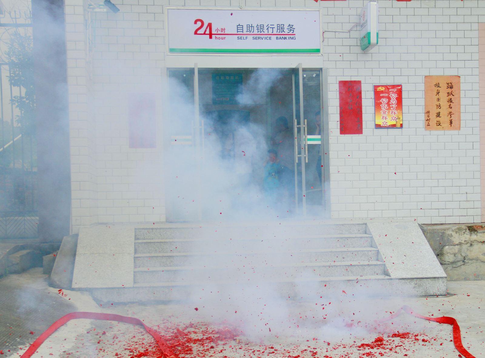 听说村里的自助银行要开业了,村会计赶紧买来一挂鞭炮以示庆祝