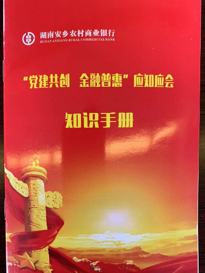 为深入开展“党建共创、金融普惠”大走访工作,方便党员干部和信贷客户经理学习金融基础知识,确保入脑入心,近日,安乡农商银行紧扣工作主题,编印《“党建共创、金融普惠”应知应会知识手册》,并发放至全体党员干部和信贷客户经理。