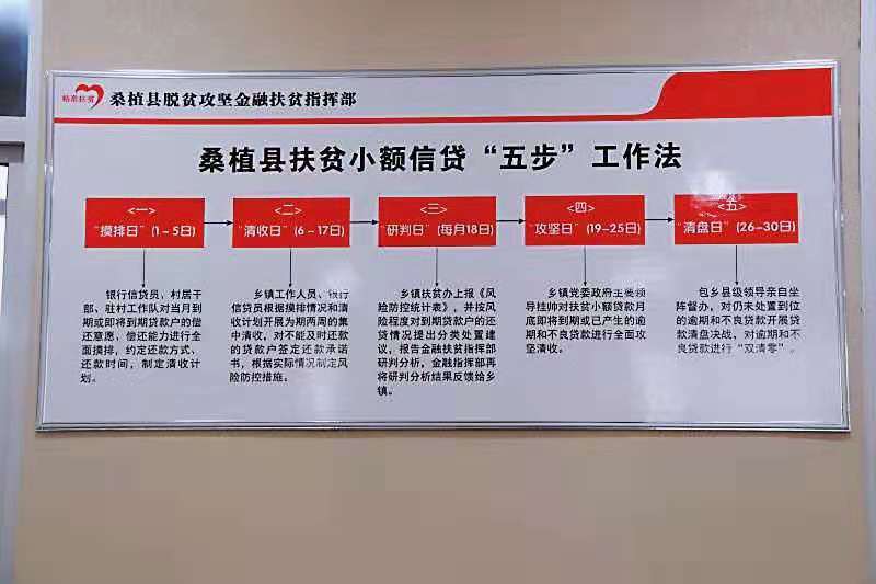 政银联动,构建清收体系。该行的扶贫小额信贷风险防控工作得到县委县政府的大力支持,扶贫小额信贷工作被纳入政府部门重要议事日程,高规格统筹联动。政府成立县脱贫攻坚金融扶贫指挥部,由常务副县长任指挥长,分管副县长主抓,该行董事长具体抓,抽调该行信贷部骨干与县扶贫办人员,专项开展扶贫小额信贷清偿和风险防范化解工作;各支行与当地乡镇党委分别成立了清收工作小组,支行客户经理、村支“两委”及驻村工作队全程参与,形成了政银联动,拧成“一股绳”,全力推进的工作模式。
