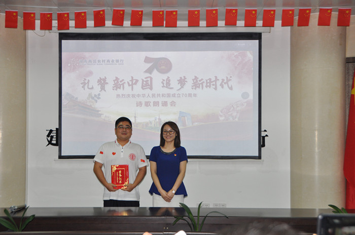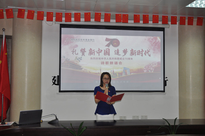 9月29日晚,南岳农商银行在四楼会议室开展了以“礼赞新中国 追梦新时代”为主题的诵读活动。经过报名,全行共计27名员工参加了比赛,共13个参赛节目。