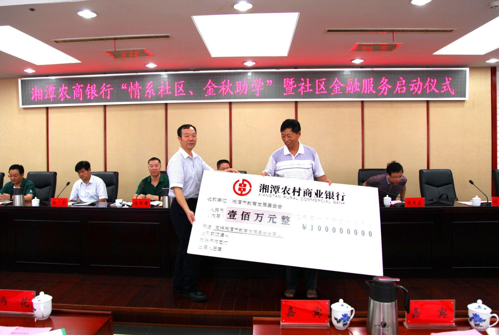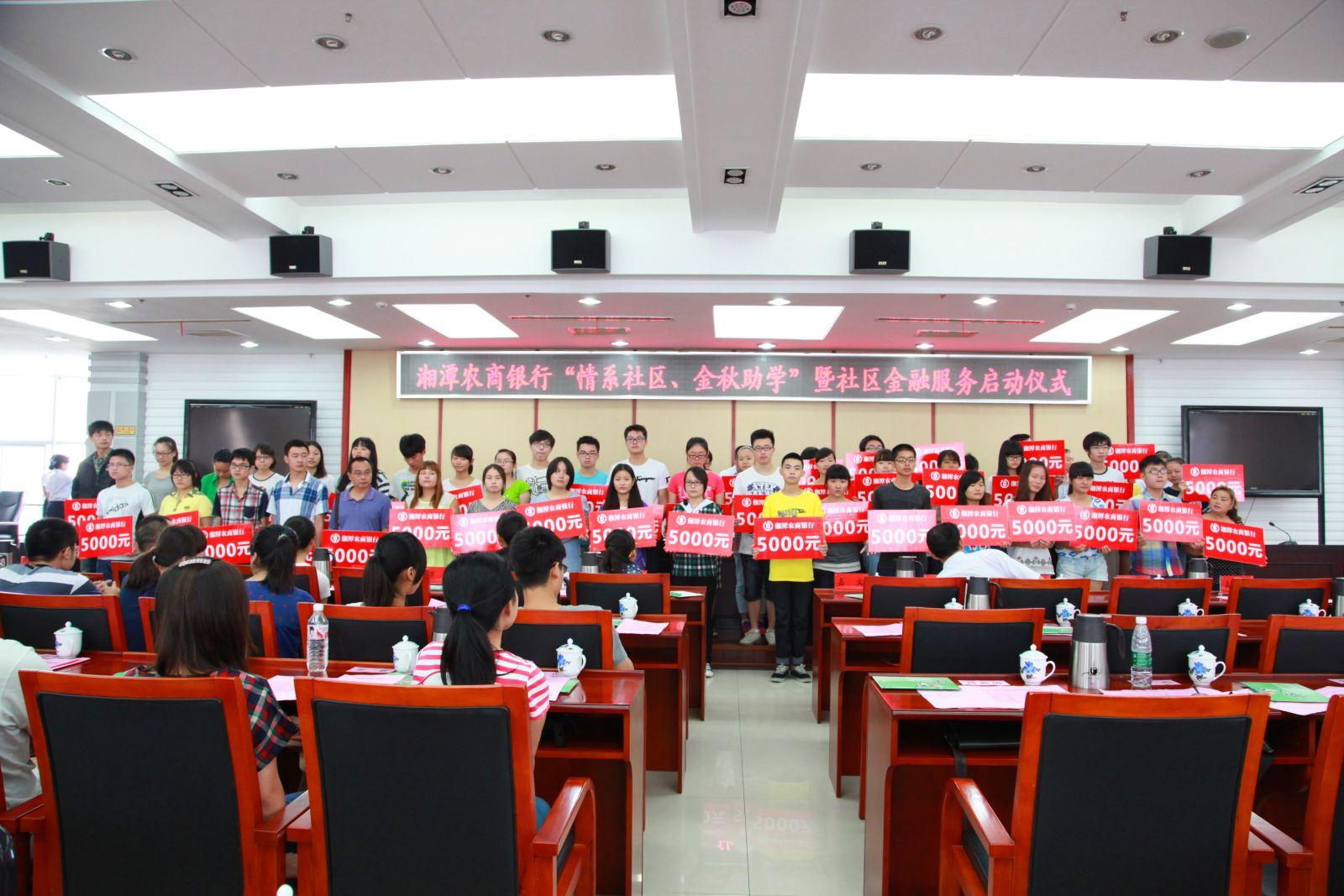 启动仪式上,与会领导分别为43家社区金融服务联络点授牌。湘潭农商银行董事长刘浩代表该行向市教育发展基金会捐赠100万元。现场150名受助学子每人获得5000元的“金秋助学”捐赠。