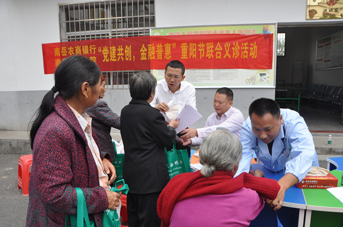 10月9日上午,南岳农商银行联合南岳区卫生院在岳东社区居委会举办“党建共创、金融普惠”重阳节义诊活动,本次活动将持续三天,到10月11日结束。