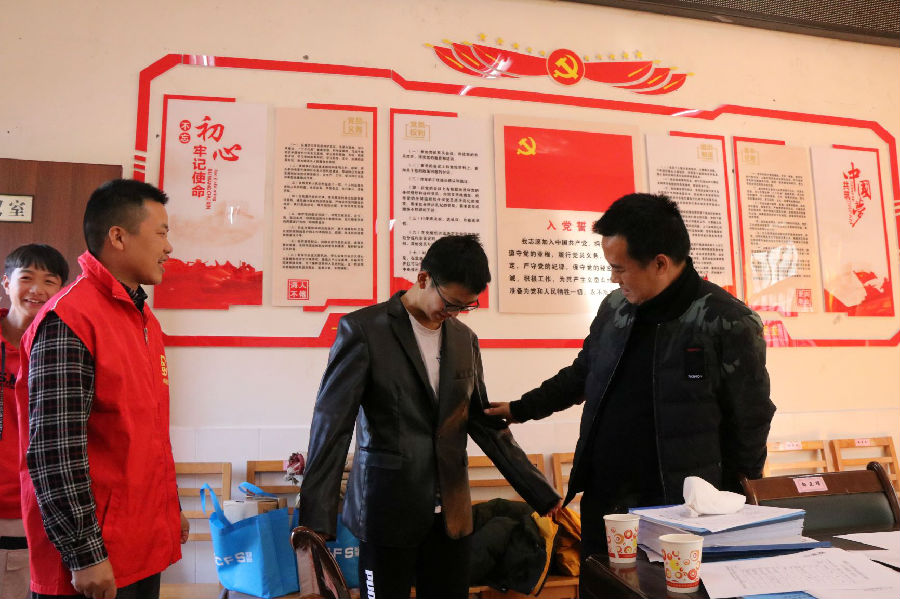 捐赠仪式在马合口学校的二楼会议室进行,受捐的孩子们衣着单薄,通红的小脸上写满拘谨,眼里洋溢着对冬日衣物的期待。看到孩子们的到来,志愿者们快速地将衣服鞋子的包装拆开,好让孩子们能尽快试一试衣服,看看合不合身。一个女孩子脱下自己薄薄的外套,穿上了两位志愿者阿姨递过来的白色羽绒服,一抹微笑浮现在她的脸上,看来很是合身呢。志愿服务队队长寄语同学们,希望他们好好学习,常怀感恩的心,用优异的成绩回报社会。