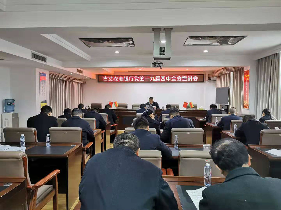 12月12日,古丈农商银行在总行五楼会议室召开学习党的十九大四中全会精神,总行党委班子成员、机关部室主要负责人、各支行长共32人参加理论学习和讨论,党委委员、副行长原文学习党的十九大四中全会公报,摘要学习《中共中央关于坚持和完善中国特色社会主义制度、推进国家治理体系和治理能力现代化若干重大问题的决定。并开展讨论,各支行就如何学习党的十九大四中全会精神与全年经营目标工作完成及党建共创金融普惠有机结合起来进行汇报,各部室根据联点支行党建共创金融普惠谈了感受和体会,并作了表态发言。
