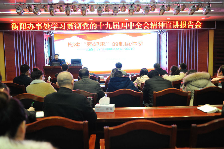 12月19日晚上,衡阳办事处组织学习贯彻党的十九届四中全会精神宣讲会,邀请中共衡阳市委党校经济学教研室主任谭焱恒副教授主讲《构建“强起来”的制度体系——党的十九届四中全会精神解读》,从“重要意义”“充分认识中国特色社会主义制度的内涵”“准确把握中国特色社会主义制度的显著优势”“与时俱进完善中国特色社会主义制度”四个层面对党的十九届四中全会精神进行解读。办事处机关全体人员参加学习。