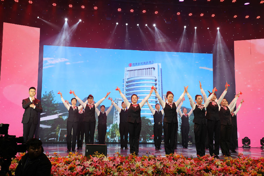 晚会精彩纷呈,高潮迭起,吉首农商银行100余名员工参与了现场演出,载歌载舞,先后表演了歌舞、联唱、古典舞蹈、情景剧、诗歌朗诵、独唱等10个节目。其中,由行领导和员工代表参演的原创歌曲《一心为三农》更是奏响了农商人昂首阔步迈向未来的新时代强音,现场效果振奋人心,观众们纷纷拍手叫好。