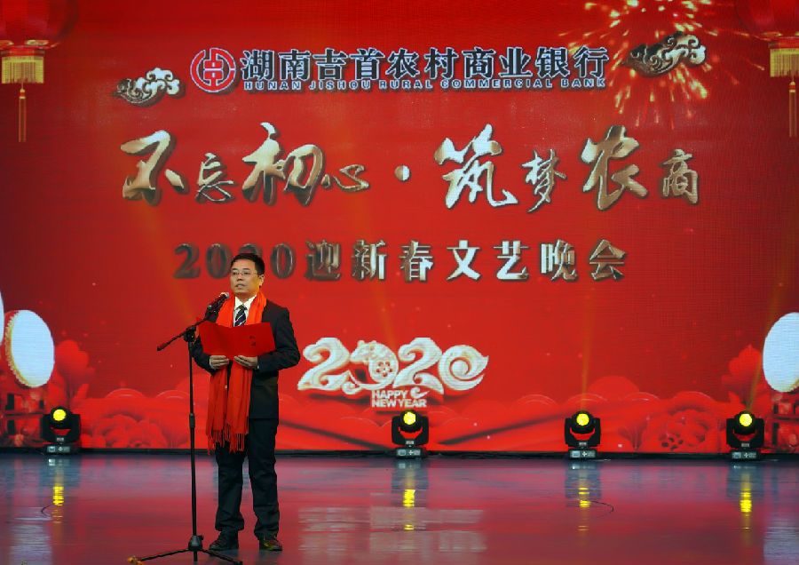 吉首农商银行党委书记、董事长郑崇武为晚会发表了热情洋溢的开场致辞,向一直以来关心支持吉首农商银行各项事业发展的各部门,社会各界人士,广大客户和股东表示了衷心的感谢!向全行员工及员工家属表达了崇高敬意!号召全体员工在新的一年里,书写好“用温度传递温暖,用压力激发活力,用品质树立品牌”三篇文章,力争用2-3年时间把吉首农商银行打造成有温度、有活力、有品质的百姓银行。