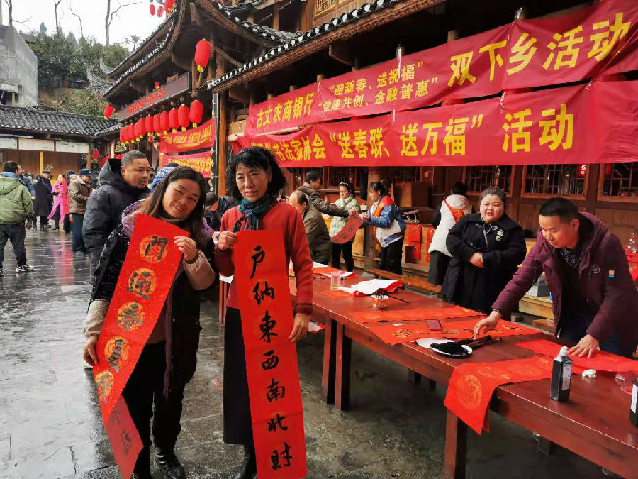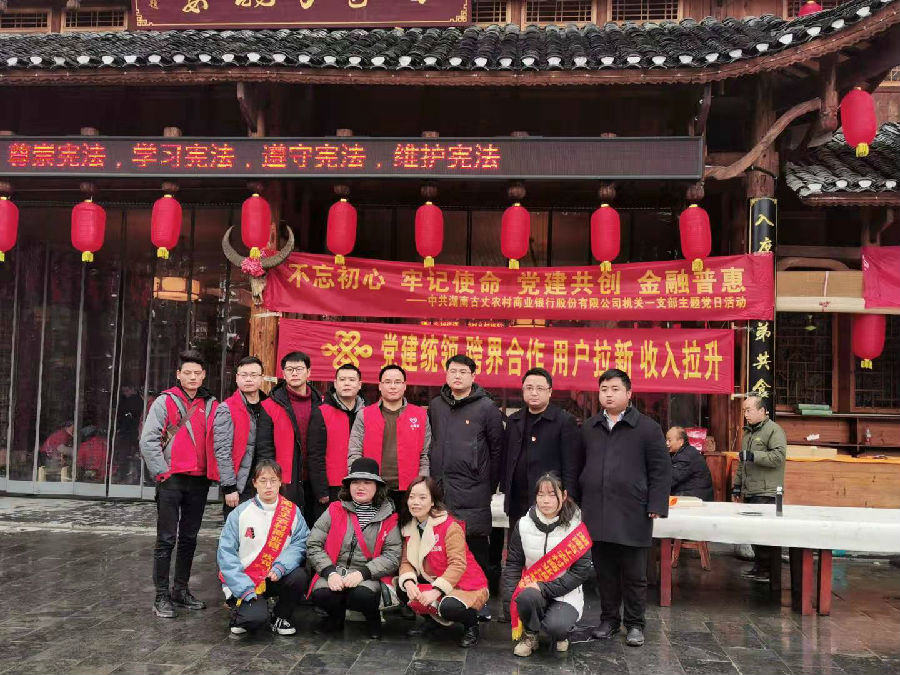 2020年1月11日,古丈农商银行机关一支部党员深入默戎苗寨,与默戎苗寨党支部共同开展迎新春送祝福党日主题活动,机关一支部联系领导石刚副行长参加党日主题活动,为苗寨人民送上全行的新春祝福,活动当为苗寨村民和游客及旅游公司员工送出对联230对,福字30幅,得到了苗寨的一致好评。