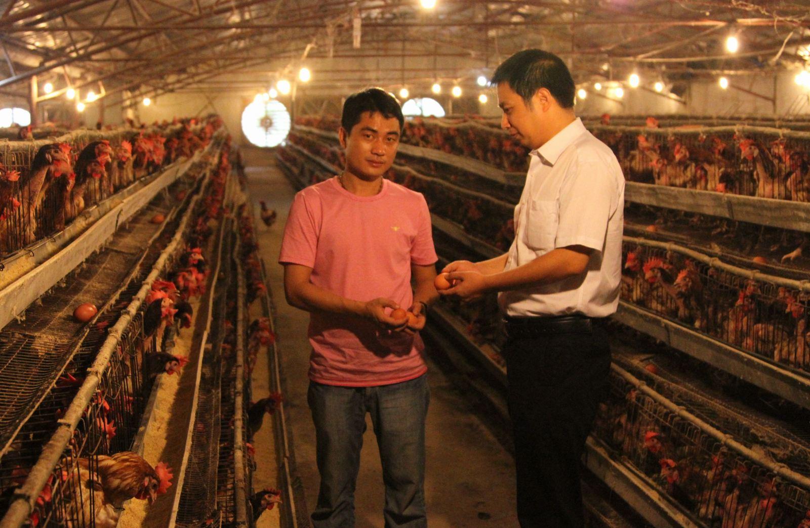 图为祁阳县观音滩镇天堂村返乡农民工唐志亮(左),在当地信用社的支持下发展蛋鸡养殖,目前他的众信蛋鸡养殖基地发展蛋鸡6万羽,产生了良好的经济效益。