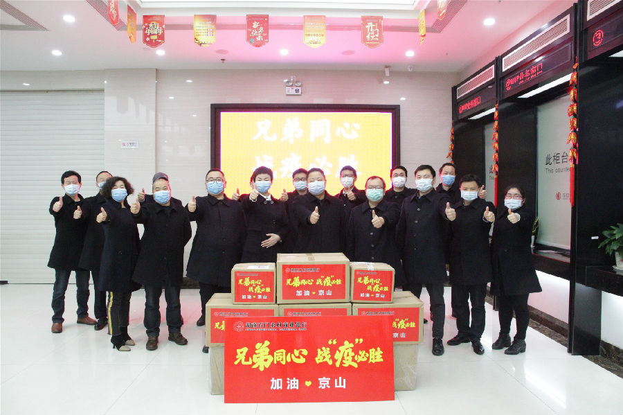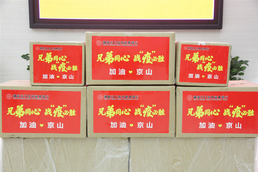 湘鄂同源,两湖情深,源于2019年 “金融村官”引来的缘分,在获悉京山农商银行防疫物资紧缺时,石门农商银行发扬“一方有难、八方支援,全国农信一家亲”的光荣传统,以最快速度、尽最大可能,短时间内筹集了1万只医用口罩和1千副手套,并通过邮政绿色通道完成了包装寄送工作,为京山农商银行送去了376位石门农商儿女的爱心与祝福。物资盒上的标语“兄弟同心 战疫必胜”更是传递出了疫情当前,农商银行众志成城,共战疫情的温暖和温情。