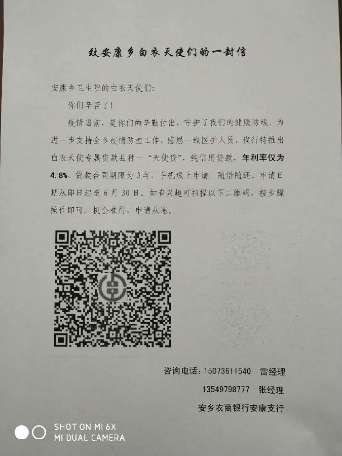 为推广“天使贷”, 3月6日上午,安康支行客户经理做好防护措施,带着自制的宣传单进入乡卫生院进行营销宣传,院长毕文瑰是第一个营销对象,当客户经理现场引导其线上操作,足不出户,仅五分钟就完成贷款的申请和预审,毕院长不由的感叹农商银行的方便快捷和社会担当,当即表示要为农商银行当好义务推广员。“雷行长,你们放心,我已经到单位群里发了通知,并安排专门干部到各科室宣讲,你们这是为我们一线医务人员做好事,感谢你们的关心,让我们感受到了温暖”。