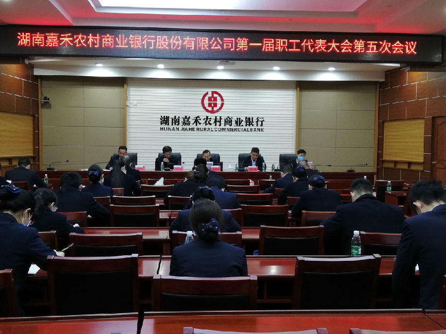 近日,嘉禾农商银行第一届职工代表大会第五次会议在总行二楼会议室召开,总行党委领导班子和28名职工代表参加。会议由总行党委委员、副行长胡国生主持,大会审议通过了《湖南嘉禾农村商业银行股份有限公司员工行为管理十条禁令》、《嘉禾农村商业银行2020年度绩效工资考核办法》和《嘉禾农村商业银行2020年度综合目标考核办法》 。