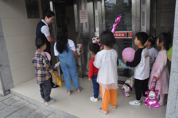 活动现场,城东支行提前准备好了糖果、气球、小礼物等,营造出了浓厚的节日氛围,受邀参加活动的金鹰卡通幼儿园小朋友在家长的陪同下,一一领取了礼物,并在工作人员的带领下参观了ATM存取款机,了解自助设备基本使用方法。