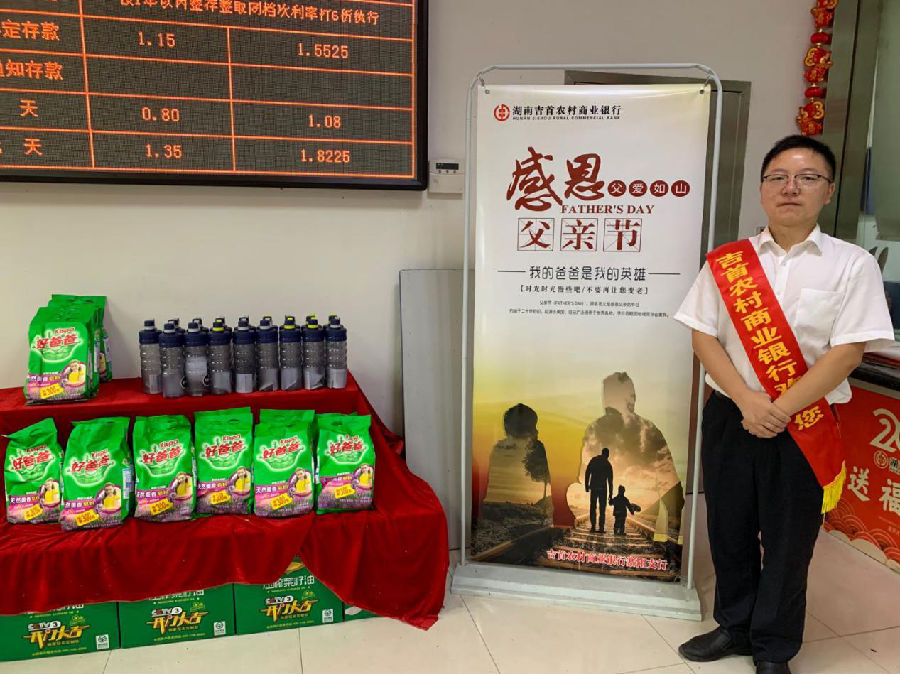 “父爱如山,感恩父亲节!”6月21日,吉首农商银行寨阳支行借助父亲节契机,以此来感谢新老客户长期以来对该行的信任与支持,特地举办父亲节厅堂回馈活动,为前来办理业务的“父亲们”送上“好爸爸”牌洗衣粉、保温茶杯等小礼品,让客户感受到吉首农商银行的温暖。