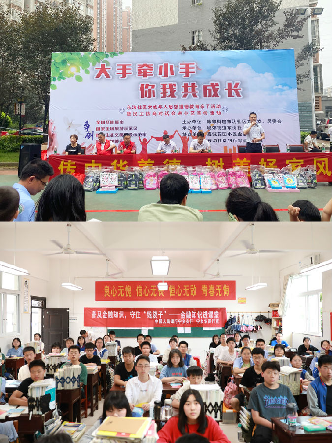 5.开展“大手牵小手”校园金融宣传活动。东沩社区党总支、居委会联合宁乡农商银行社区银行综合体举办“大手牵小手,你我共成长”——东沩社区未成年人思想道德教育亲子活动。营业部与玉潭中学高一学生开展“金融知识进课堂”宣传活动,人民银行宁乡支行工作人员能用通俗易懂的语言与孩子们亲切互动,通过金融小故事、生活案例分析、游戏竞猜等活动进行金融知识的普及,结合实例帮助孩子们树立正确的消费观和诚信价值观,让孩子们了解信用在生活中的重要性,并自觉在生活中养成讲诚信、守信用的良好品德。此次活动吸引了众多学生的积极参与,现场学生们跃跃欲试,主动前来了解咨询金融知识,活动加深了学生对金融知识的深入了解,提升了孩子们对金融安全意识和风险识别的能力。