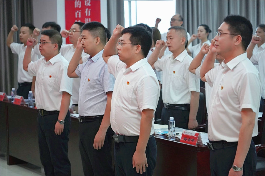 会议在庄严神圣的国歌中拉开序幕,该行全体党员高举右拳,在党委书记郑崇武的带领下重温入党誓词。