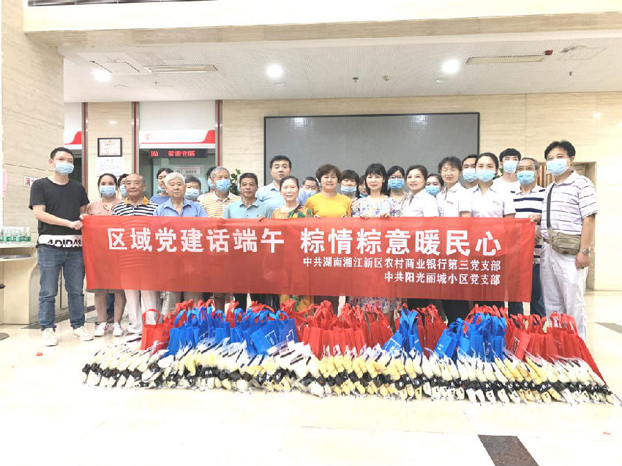 “五月五,是端午。门插艾,香满堂。吃粽子,洒白糖。龙舟下水喜洋洋。”伴随着孩子们童真的歌谣声,“金阳社区乐百姓、农商银行福万家”的端午节主题党日活动在湘江新区农商银行营业部大厅正式拉开帷幕。