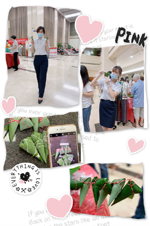 在摆满了糯米、赤豆、绿豆、猪肉、长绳、粽叶等材料的圆桌面前,巧妇们准备一展身手,双手麻利地将粽叶卷成漏斗状后,用糯米充实压紧,再用细绳一绕、一捆……转瞬一个个新鲜碧绿、饱满漂亮的粽子就包好了;老同志也充分发挥传承精神,对年轻一辈手把手教学,人生中的第一个粽子就陆续在新手们手中诞生了;前来体验的小朋友也亲力亲为,一边交流学习,一边比赛谁包的好包的多,很快一个个样式漂亮的粽子瞬间成型。活动现场,居民们或围坐在一起,或相互指导、相互帮助,在欢声笑语、一片祥和的氛围中,把“邻里情”和满满的祝福包进了各式各样精致的粽子里。