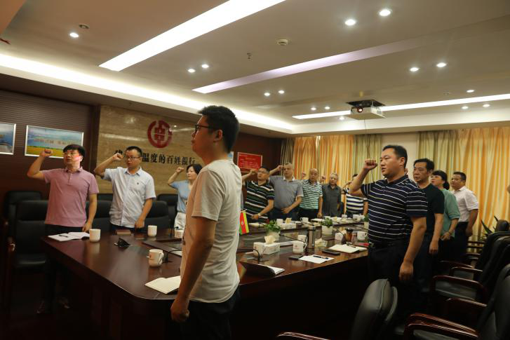 支部全体党员在支部书记吴胜的带领下,在鲜红的党旗前举起右手,重温入党誓词,也重温入党宣誓时的庄严承诺和坚定决心。