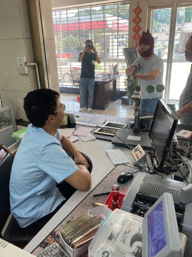 在防暴演练中,由员工扮演的犯罪份子进入营业厅持“枪”准备实施抢劫,网点人员按照预案规定的处置程序,一边稳住“歹徒”,一边设法将信息传递出去并及时报警,最终成功将“歹徒”制伏。