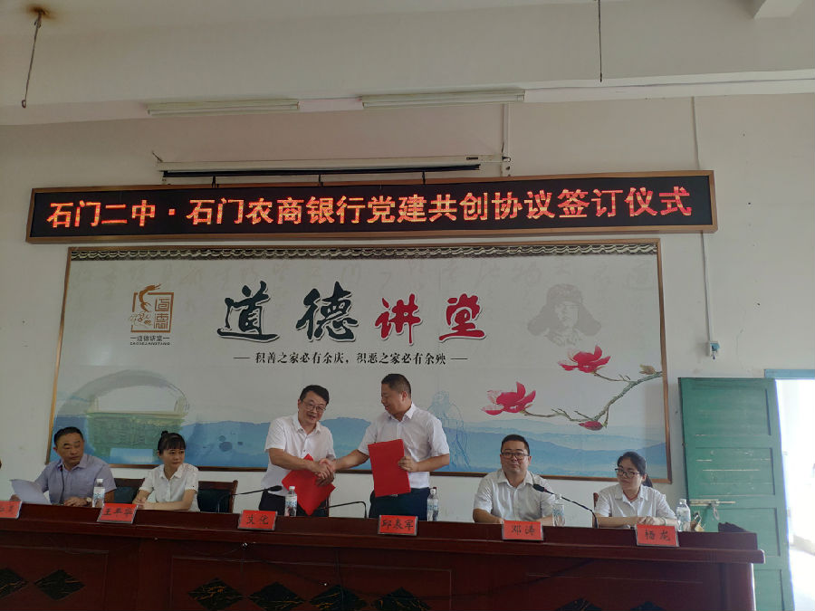 仪式上,石门农商银行还与石门二中和石门一完小分别签订了党建共创合作协议,今后,双方将在党群建设、金融普惠、业务拓展、人才培养、企业文化等方面深入开展学习交流。