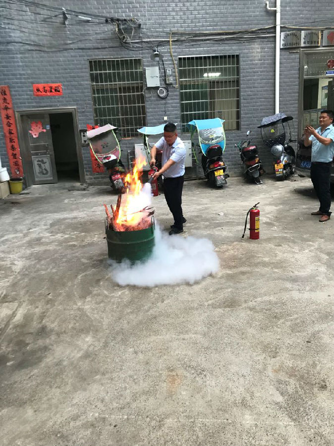 此次消防演练培训由鳌峰社区第一党支部书记李建新和鳌峰社区民兵营长李雄利进行消防知识现场讲座及消防现场演练。李建新支书首先为东塔支行5名员工详细讲解消防安全应急操作与火场逃生技巧,用生动的场景例子讲述一旦发生火灾,如何正确地报警、扑救、疏散,如何自救和逃生。接着李雄利营长现场演示了用手提式灭火器灭火的操作方法:一“拔”拔掉保险栓;二“握”握紧喷管喷头;三“压”压下握把;四“准”准心火焰对准根部灭火。重点介绍了灭火器的有效使用距离,使用角度,使用站位等注意事项。最后模拟火情现场,手把手地教会支行员工正确使用灭火器,进行消防安全预演排练。