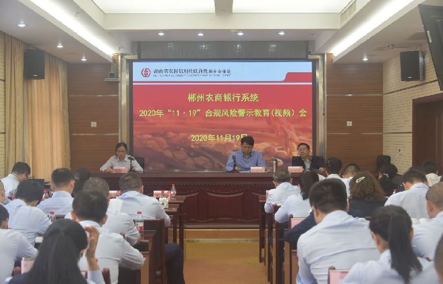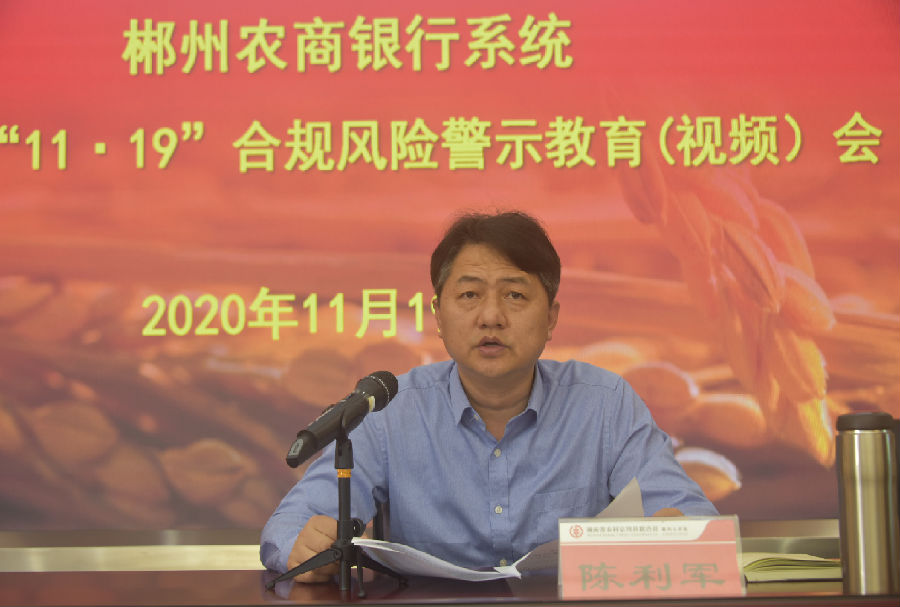 11月19日上午,郴州办事处举行全市农商银行系统2020年“11·19”合规风险警示教育日活动。市办事处党组成员、纪检组长、副主任陈利军出席活动并讲话,党组成员、副主任雷青龙主持活动。