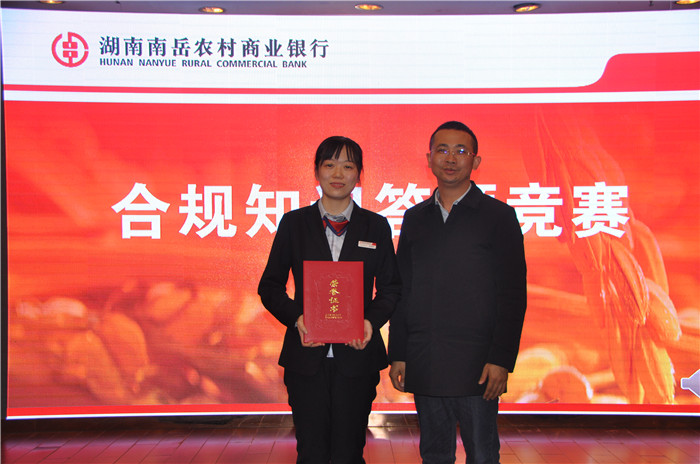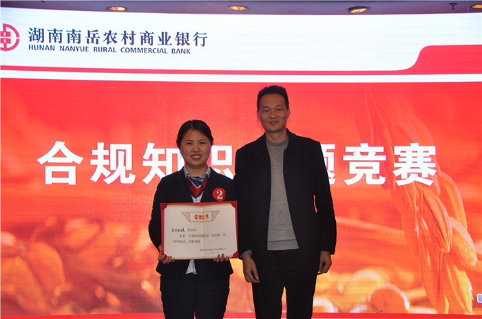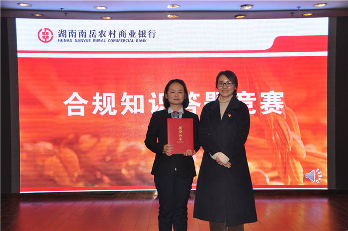 经过激烈角逐,水濂、新村支行代表队获得第一名,南岳镇支行获得第二名,总行机关代表队获得第三名,其他代表队获得优胜奖。党委班子为第一、二、三名获奖代表队及合规主题征文比赛获奖选手颁奖。