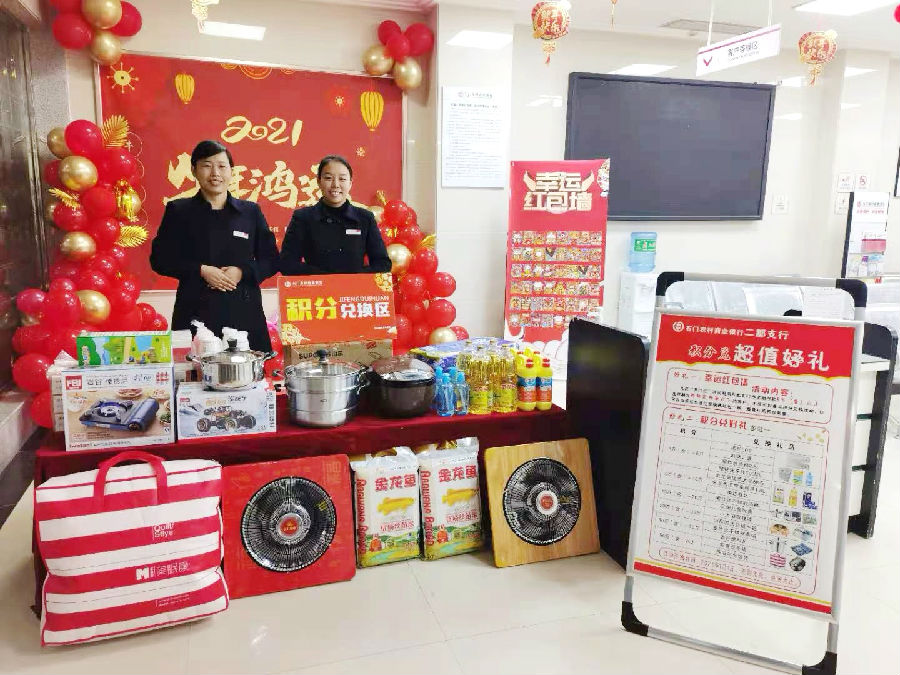 营业大厅内,活动礼品井然有序摆放,明示积分兑换礼品标准,设置新年“打卡点”,增强与客户的互动联结,吸引客户眼球。