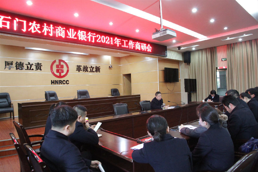 1月12日上午,石门农商银行召开2021年工作商研会,总行班子成员,部门负责人,支行行长、机关其他员工、副行长、委派会计、客户经理、柜员等员工代表共计50余人参会。