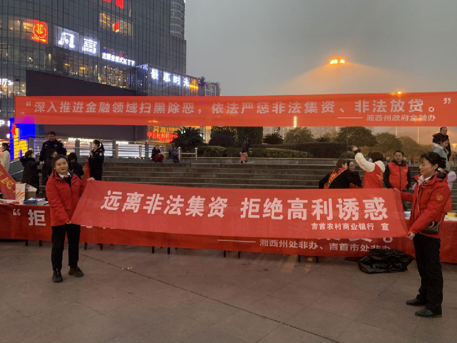 为做好春节前防范非法集资宣传,营造群防群治良好社会氛围,1月20日晚,湘西州政府金融办(州处非办)、吉首市处非办、州公安局、人民银行湘西州中心支行、湘西银保监分局联合吉首农商银行等多家金融机构在世纪广场开展防范非法集资宣传教育活动。