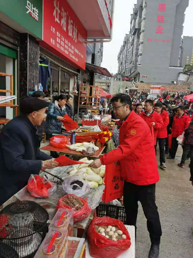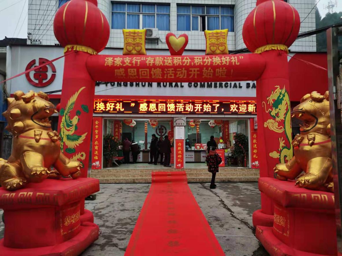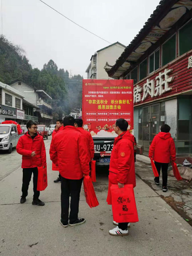 活动中,在支行坪院门口设立了拱门、铺设红地毯、摆放宣传展架,对厅堂进行了精心布置;租用流动广告宣传车,搭载广告牌,在全镇范围内进行循环播放;对沿街商户、赶集农户分发宣传折页、派送春联,进行访客户、问需求,极力拉近同农商银行的关系。