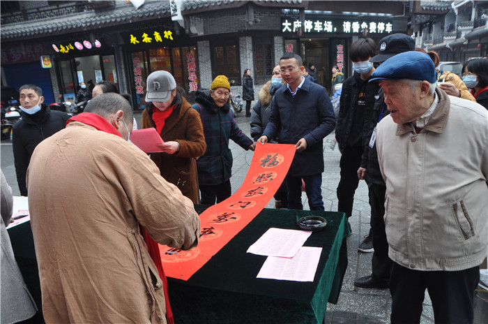 长桌排开,笔墨铺就,书画家们挥毫泼墨,手中的毛笔龙腾蛇舞,一幅幅饱含着浓浓年味、寓意吉祥的春联福字跃然纸上,春联一“出炉”,就被现场热情的老百姓“抢走”了,场面十分热闹。
