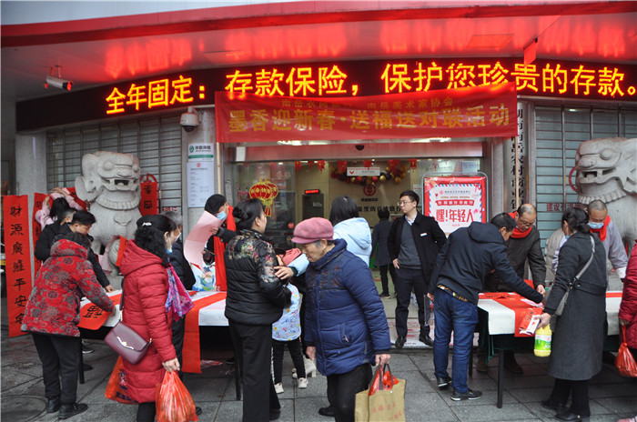 妙笔生花送祥瑞,翰墨留香迎新春。为迎接2021年新春佳节的到来,营造春节喜庆祥和的氛围,2月4日上午,南岳农商银行联合南岳美协在辖内各支行开展了墨香迎新春·送福送对联活动,为群众送上新春佳节的美好祝福。