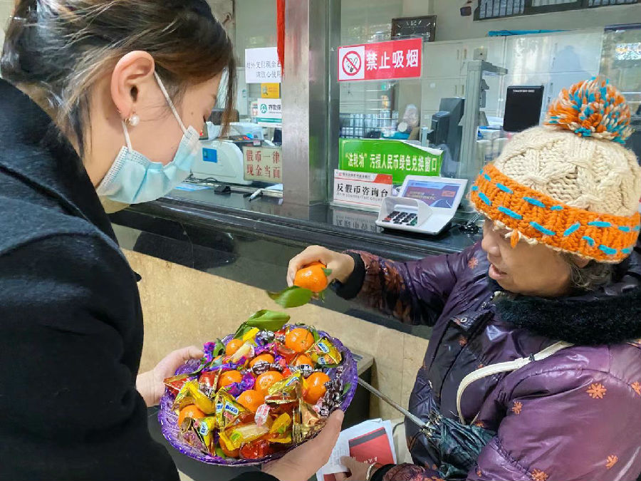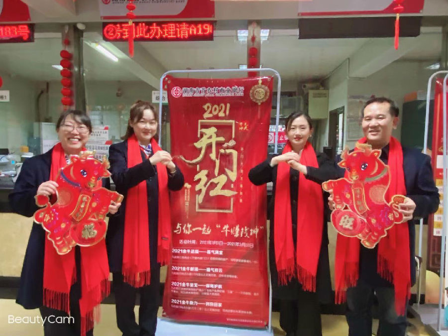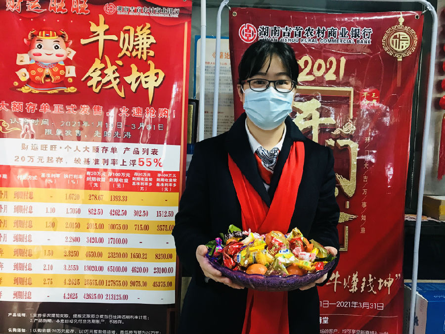 伴随着一声爽朗的“新年好!”古城分理处迎来了辛丑年的第一个客户:古城社区的小商户田大哥,田大哥开心的将10000元现金递进柜台,熟门熟路的在果盘里挑了个桔子吃,边吃边了解今年吉首农商银行开门红的政策,临走时还不忘留一句:“十五过后货卖完了我来存个定期啊”。送走田大哥,两个柜员相视而笑:银行也和商家一样,第一天的开张就是存钱,这是一个好兆头啊!