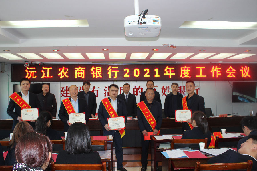 纪委书记、监事长蔡铁飞宣读了《关于表彰2020年度先进集体和先进个人的决定》,党委班子成员对先进党支部、高质量发展支行、十大沅梦奋斗者等获奖单位及个人进行颁奖。茶盘洲支行行长钟铭鑫、万子湖支行行长曾杰、资产管理中心副主任吴孟华、万子湖支行客户经理李建国、南大膳支行综合柜员邓军辉等五人作典型发言,他们开拓创新的工作方法、勤学务实的工作态度以及积极进取的工作精神,为全行员工做好2021年各项工作起到了良好的带头示范作用。