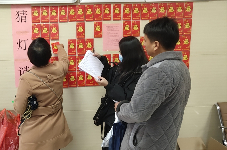 “十加八(打一字)。”“是‘架’字。”“牛牛多了两条腿(打一字)。”“是‘朱’字。”祁阳农商银行各营业大厅,前来办理业务的客户正在兴高采烈地猜着灯谜,或冥思苦想,或互相讨论,活动现场欢声笑语不断,营业大厅处处洋溢着元宵节浓厚的文化气息。