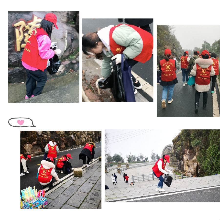 下山途中,参加登山活动的青年代表组成志愿服务队,开展了”学雷锋”保护环境卫生志愿服务活动,大家两两一队,分批清理沿路的垃圾,志愿者们不怕脏、不怕累,分工明确,把道路两边打扫得干干净净,获得了沿途游客的点赞夸奖。