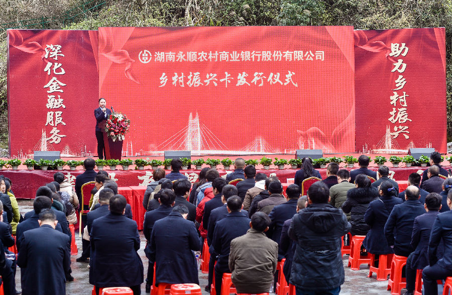 为贯彻落实乡村振兴战略,深入推进“党建共创 金融普惠 助推乡村振兴”行动,近日,永顺农商银行在永顺县石堤镇友谊村举行“福祥·乡村振兴卡”发行仪式。邀请县人民政府副县长李玉芳出席并讲话,镇村领导及代表、本行班子成员、中层干部等80余人参加发行仪式。