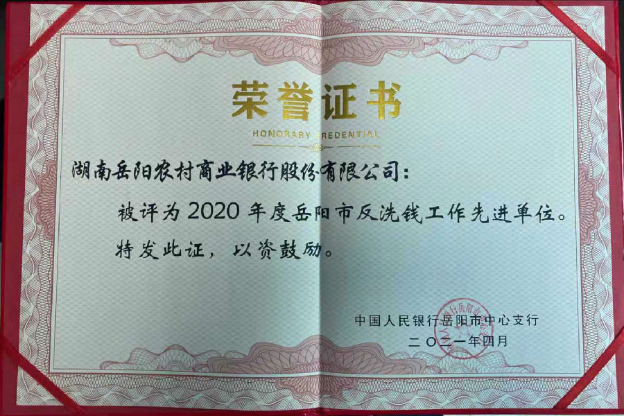 2021年4月8日,中国人民银行岳阳市中心支行组织召开全市反洗钱工作会议。会上,岳阳中支通报了2020年全市反洗钱工作情况,岳阳农商银行被评为“2020年度岳阳市反洗钱工作先进单位”,岳阳农商银行党委书记、董事长李进和反洗钱专员欧阳卓慧被评为“2020年度岳阳市反洗钱先进个人”。