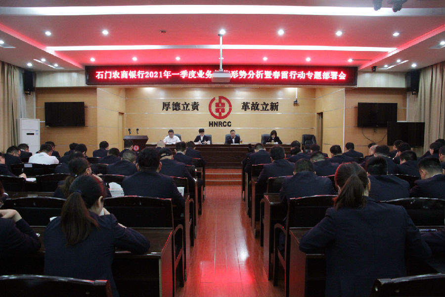 4月20日上午,石门农商银行召开2021年一季度业务经营形势分析暨春雷活动专题部署会。总行班子成员,机关部室正副经理,支行正副行长、委派会计共计110余人参会。会议由党委书记、董事长邱表军主持。