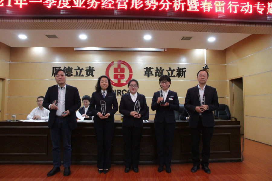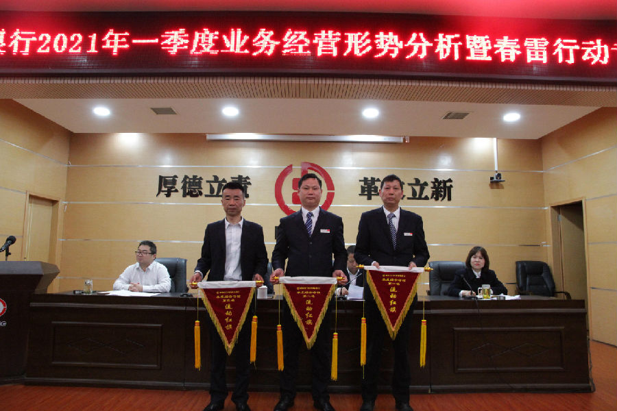 会议现场还为开门红一季度绩效考核前三名的楚江、维新、新关支行授予流动红旗,为三八女神节微视频获奖团队颁发水晶奖杯。党委委员、副行长喻俐通报了开门红一季度业务经营结账兑现情况。党委委员、副行长邓涛领学2021年风险防范化解工作方案,专题部署不良贷款自主现金清收春雷行动。各支行向总行党委递交春雷行动责任状。维新支行、营业部、楚江支行就全面工作、信贷营销、不良清收作典型发言,罗坪支行、壶瓶山支行作表态发言。