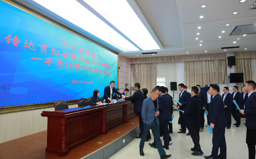 4月25日上午,宁乡农商银行组织召开传达贯彻省联社会议精神暨一季度经营形势分析会议。行党委书记刘鸿军出席会议并讲话,行党委副书记、行长邵洁玉传达全省农信系统一季度经营形势分析会会议精神并主持会议,行纪委书记、监事长黄灵芝通报一季度绩效验收及“开门红”竞赛活动情况。行党委委员、副行长李志平、省联社下派我行锻炼人员、部室正副经理、支行正副行长参加会议。