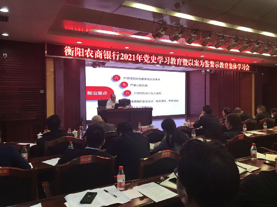 为进一步丰富党员党史学习教育内容,推动学史崇德、学史力行走实走深,使廉洁从业更加深入人心,4月27日晚,衡阳农商银行召开党史学习教育暨以案为鉴警示宣讲会,特邀衡阳市纪委监委党风政风监督室主任石海燕授课。行领导、支行正副行长、部室正副经理、客户经理等共140余人参加了学习。