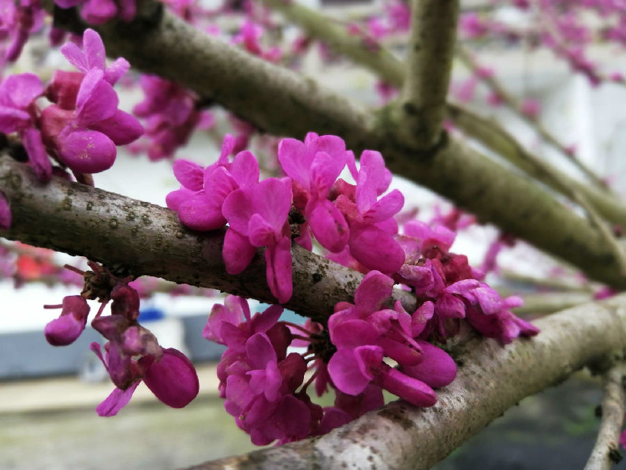 不远处,不知名的杂草,乘着春风,开着淡紫的花儿,赶来凑热闹。那些小可爱们,一朵有一朵的姿态,一朵比一朵娇媚,雕琢晚春时节的盎然和生机。