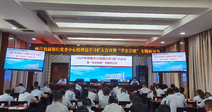 4月27日上午8:30,桃江农商银行党委中心组理论学习扩大会暨“学史崇德”专题研讨会在总行七楼会议室召开。会议由党委书记、董事长黎君辉同志主持,党委成员、董事会秘书、风险总监、部室经理、基层党支部书记、机关全体党员共计80余人参加,省联社党史学习教育督查组领导及办事处相关领导莅临本次会议。